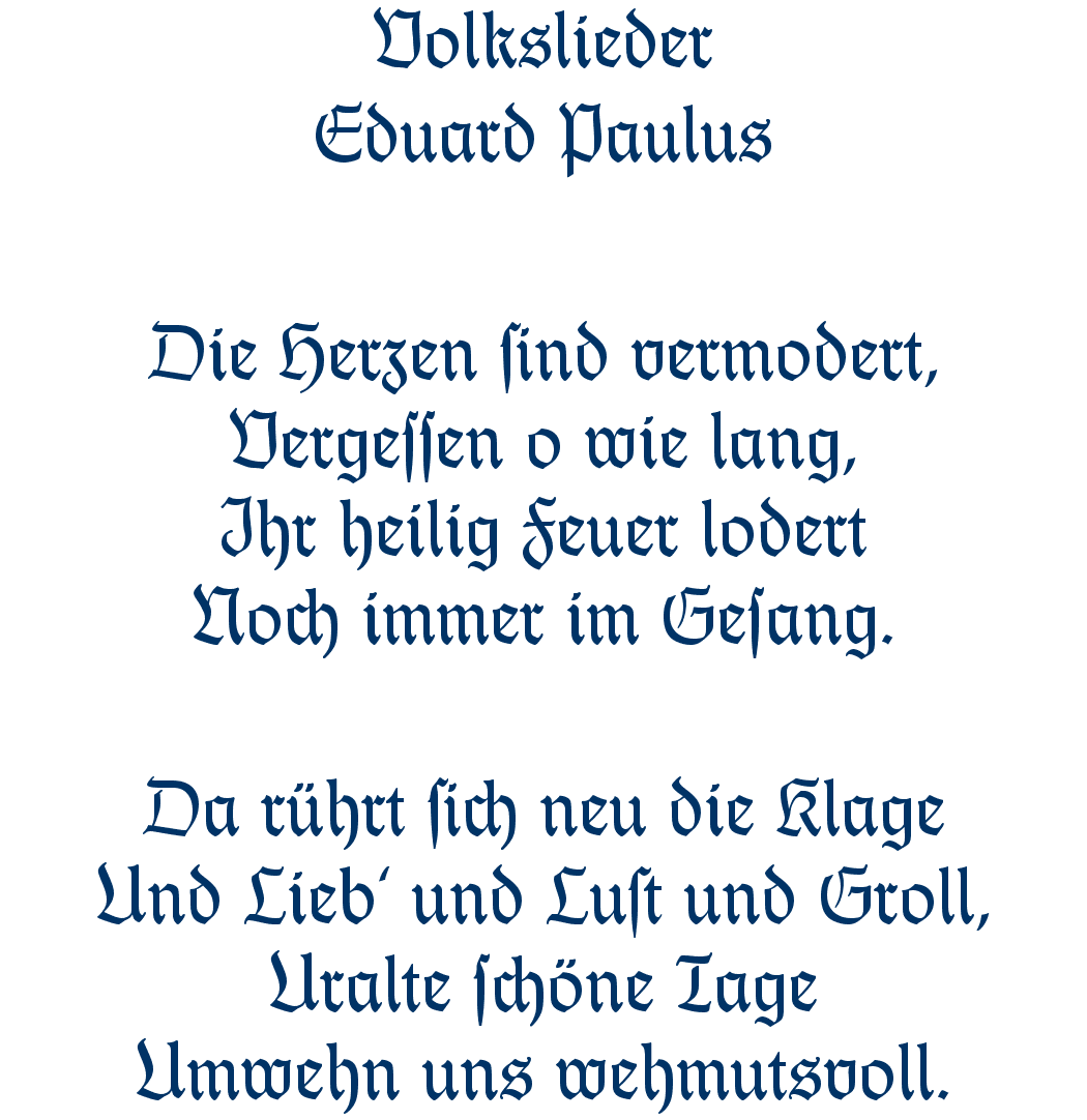Die Herzen sind vermodert, Vergessen o wie lang, Ihr heilig Feuer lodert Noch immer im Gesang.