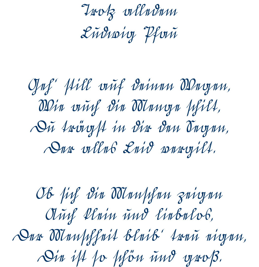 Ob sich die Menschen zeigen Auch klein und liebelos, Der Menschheit bleib' treu eigen, Die ist so schön und groß.