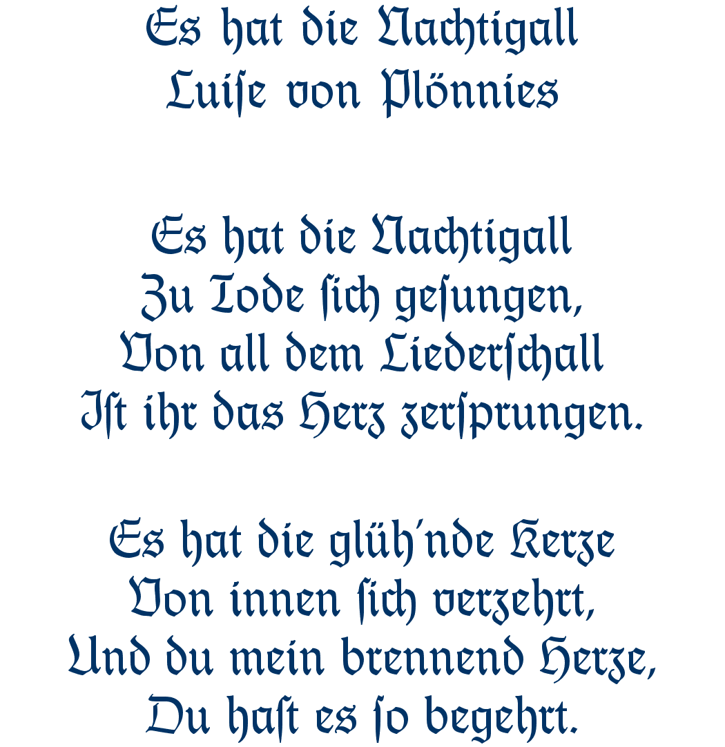Es hat die Nachtigall Zu Tode sich gesungen, Von all dem Liederschall Ist ihr das Herz zersprungen.