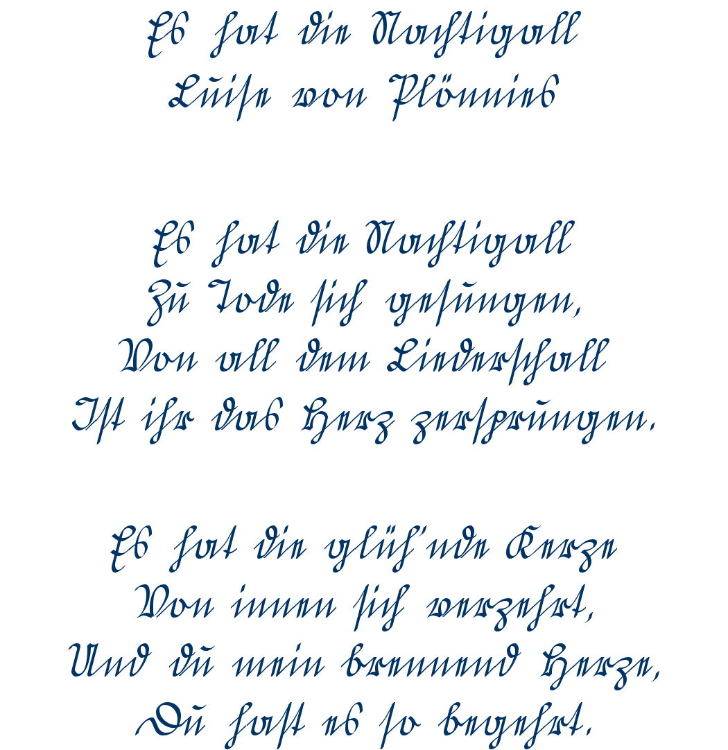 Es hat die Nachtigall Zu Tode sich gesungen, Von all dem Liederschall Ist ihr das Herz zersprungen.